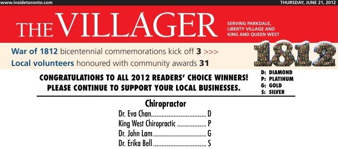 Great news everyone — Dr. Eva Chan took top spot and won the Parkdale/Liberty Villager Reader’s Choice Awards 2012 for Chiropractor of the Year!