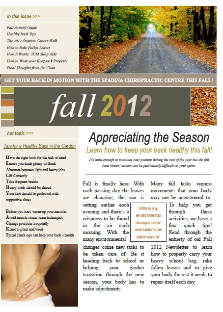 It’s our pleasure to share the Spadina Chiropractic Centre Fall 2012 Newsletter with you! Please take the time to read each section as we offer some valuable information to help keep your body healthy this fall.